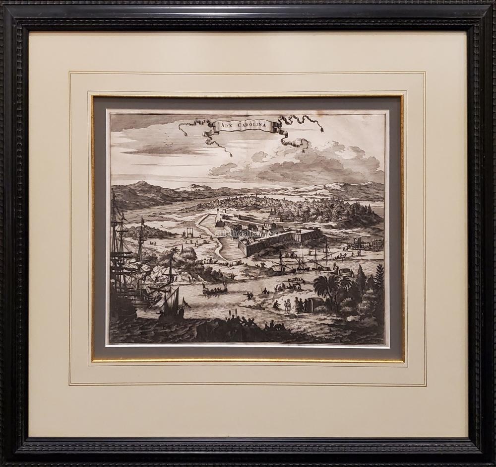 Views of Cities, Arx Carolina c.1671 - double matted engraving with hand-embellished mat & gold fillet in elegant frame - Set of 2