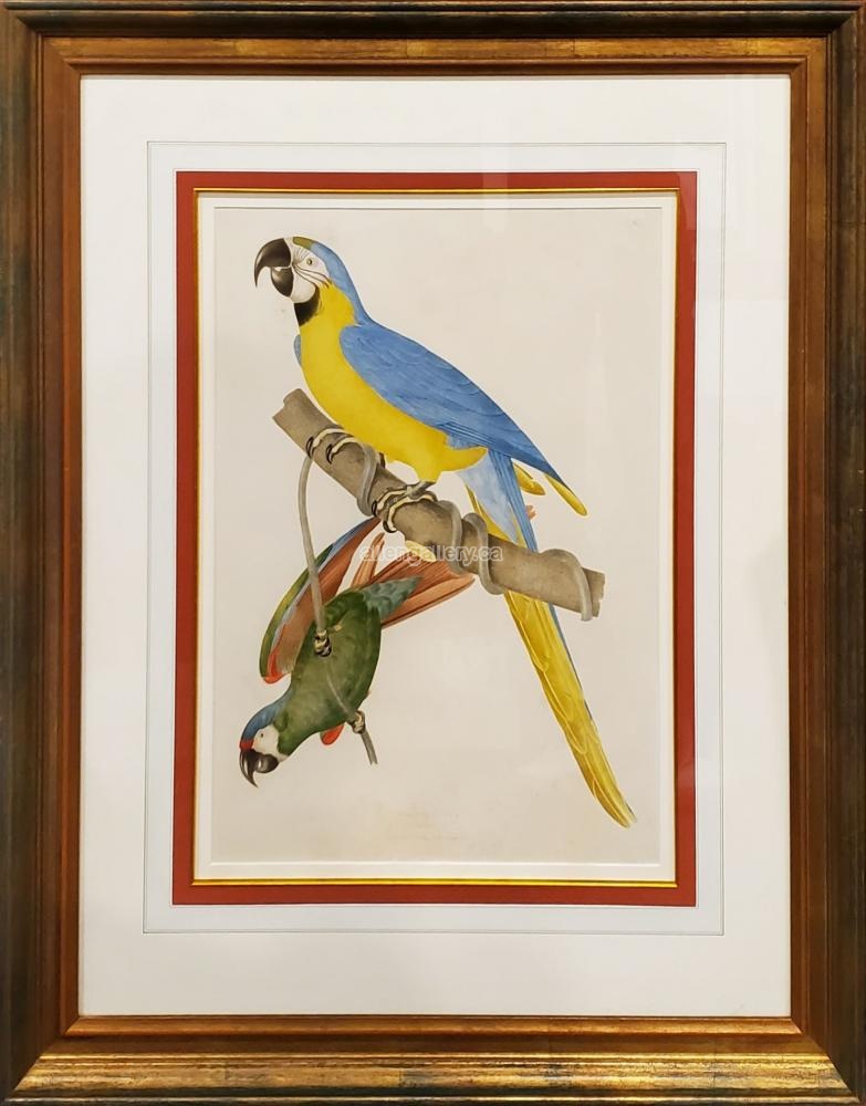Birds of Brazil, Ara Aranga Severus c.1853 - triple matted hand-coloured engraving with hand-embellished mat & gold fillet in elegant frame - Set of 2