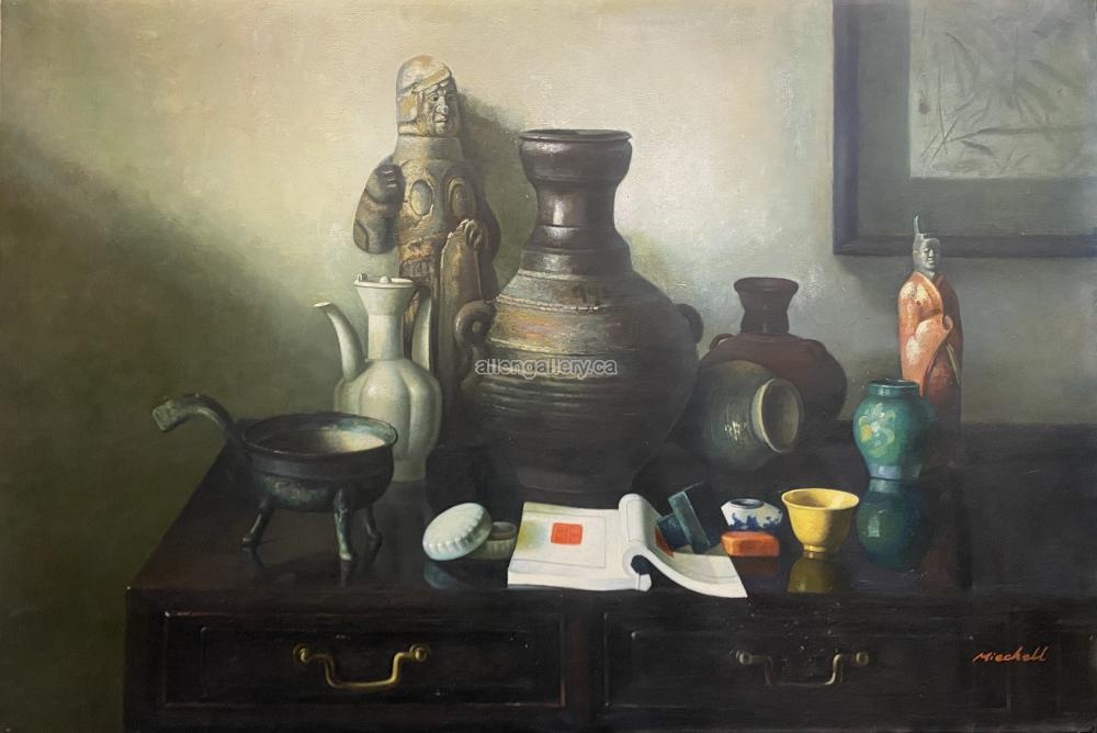 Antiquities Jars & Figurines On Dresser - original oil unframed