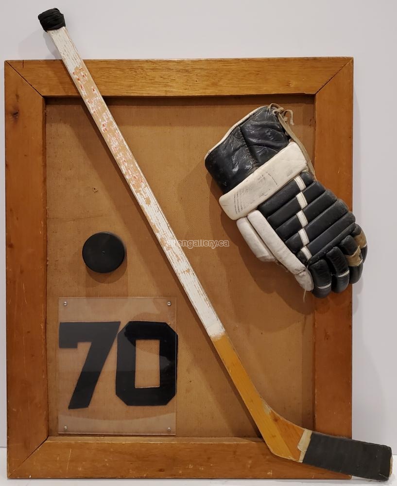 #70 Hockey - mounted stick, puck & glove in distressed frame