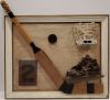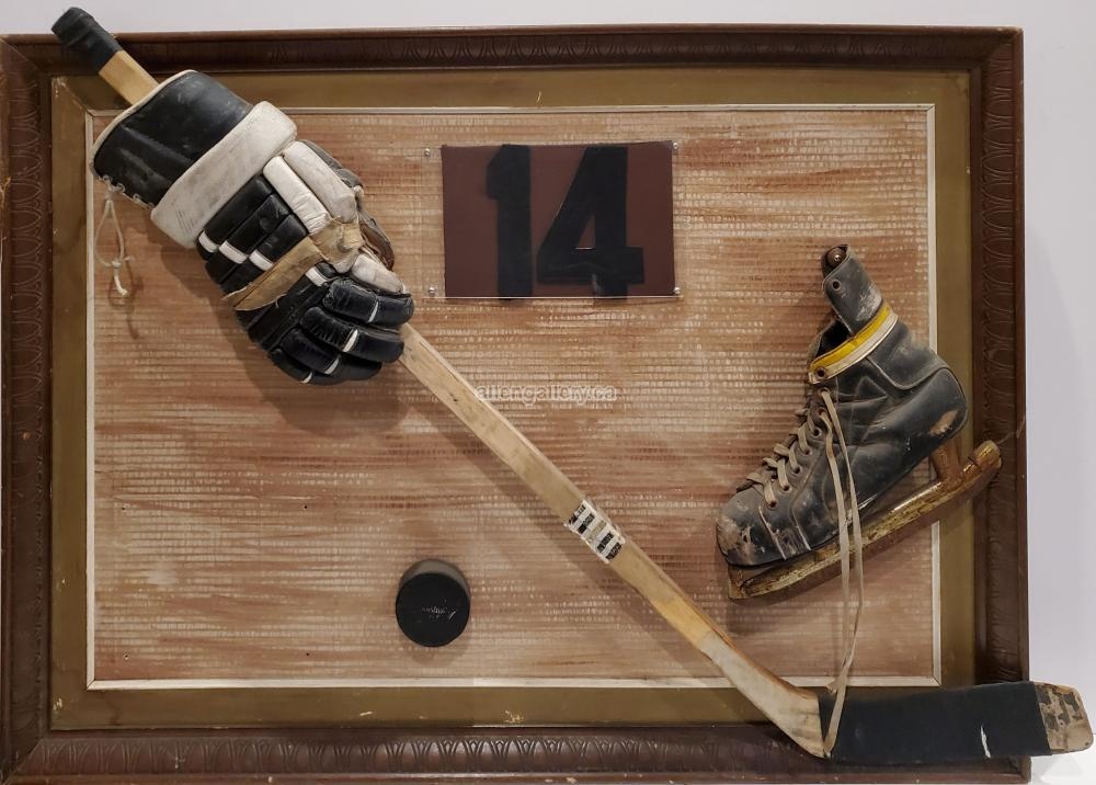#14 Hockey - mounted stick, glove, skate & puck in distressed frame