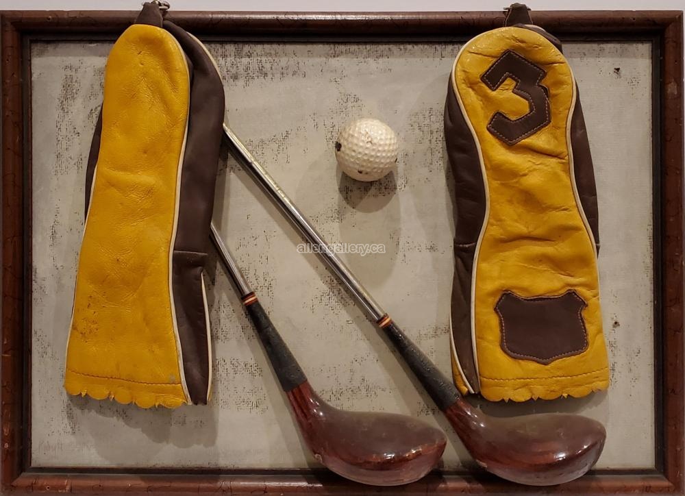 Golf - mounted clubs, cover & ball in distressed frame