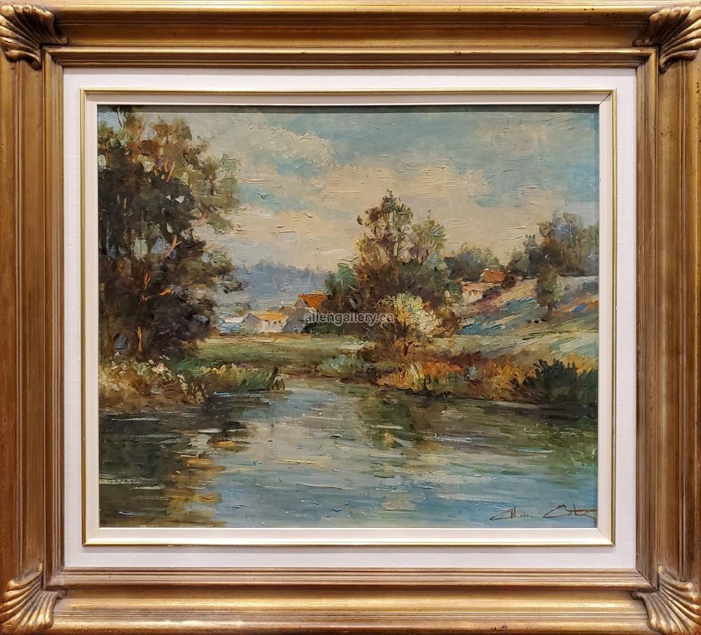 Village on the River - original oil in ornate frame with linen liner & gold fillet - available "frame only" on request (20x24 interior size)