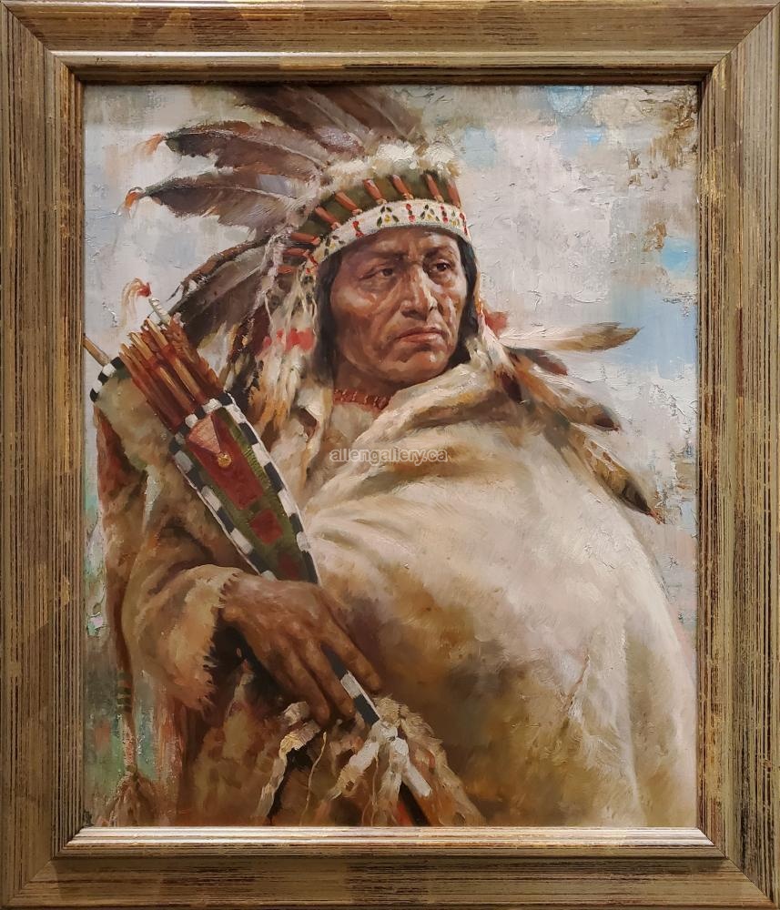Indigenous Man in Feather Headdress - original oil in rustic frame - available "frame only" on request (20x24 interior size)