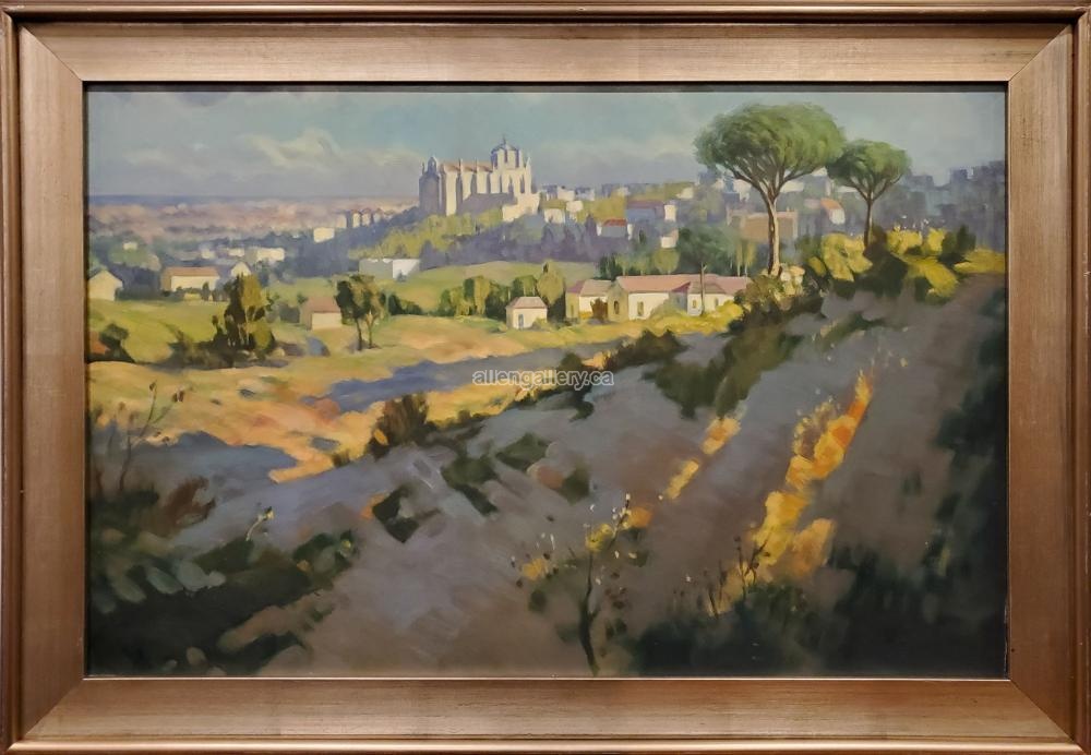 Hillside With Village In Distance - original oil in elegant frame - available "frame only" on request (24x36 interior size)
