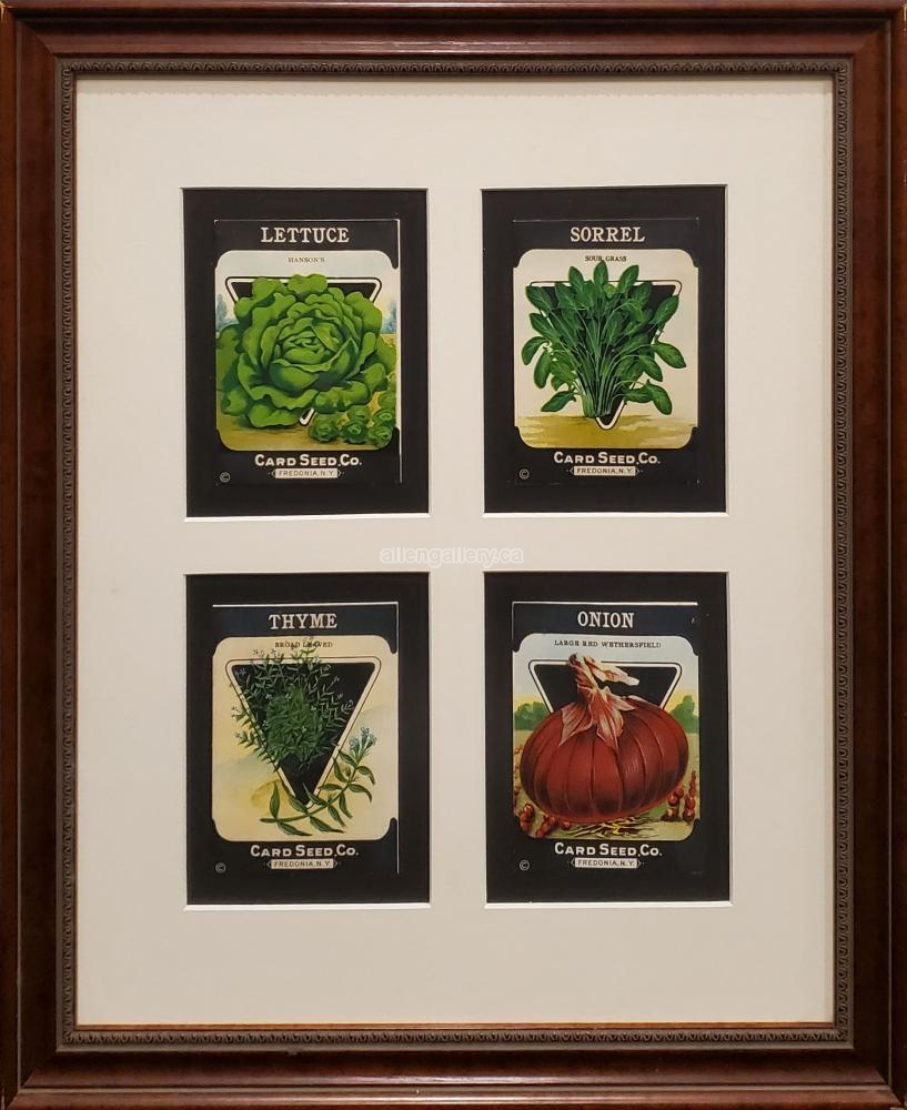 Seed Packages VIII (Lettuce, Sorrel, Thyme, Onion) c.1900 - matted chromolithographs with quadruple window mat in elegant frame with ornamented lip - Set of 11