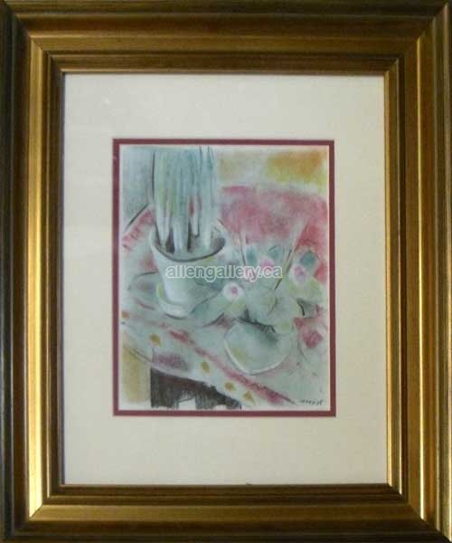 Two Flower Pots On Table Cloth (Green & Red) - double matted original pastel in elegant frame