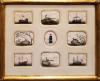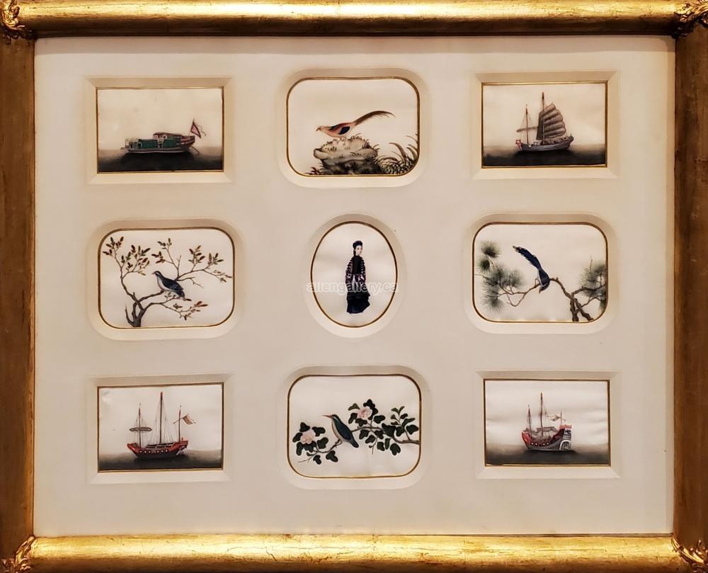 Pith Paper Miniatures (9), Tall Ships, Birds c.1830 - matted original watercolours with embellished silk multi-window mat in elegant frame with corner ornamentation - Set of 2 - glass cannot be removed