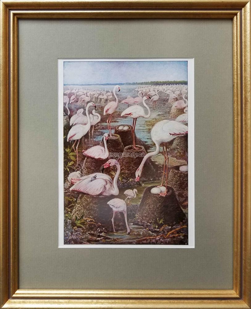 Flamingos Nesting c.1900 - matted coloured lithograph in elegant frame - Set of 2