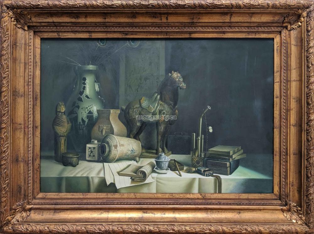 Antiques on Tablecloth - original oil in ornate frame - available "frame only" on request (24x36 interior size)