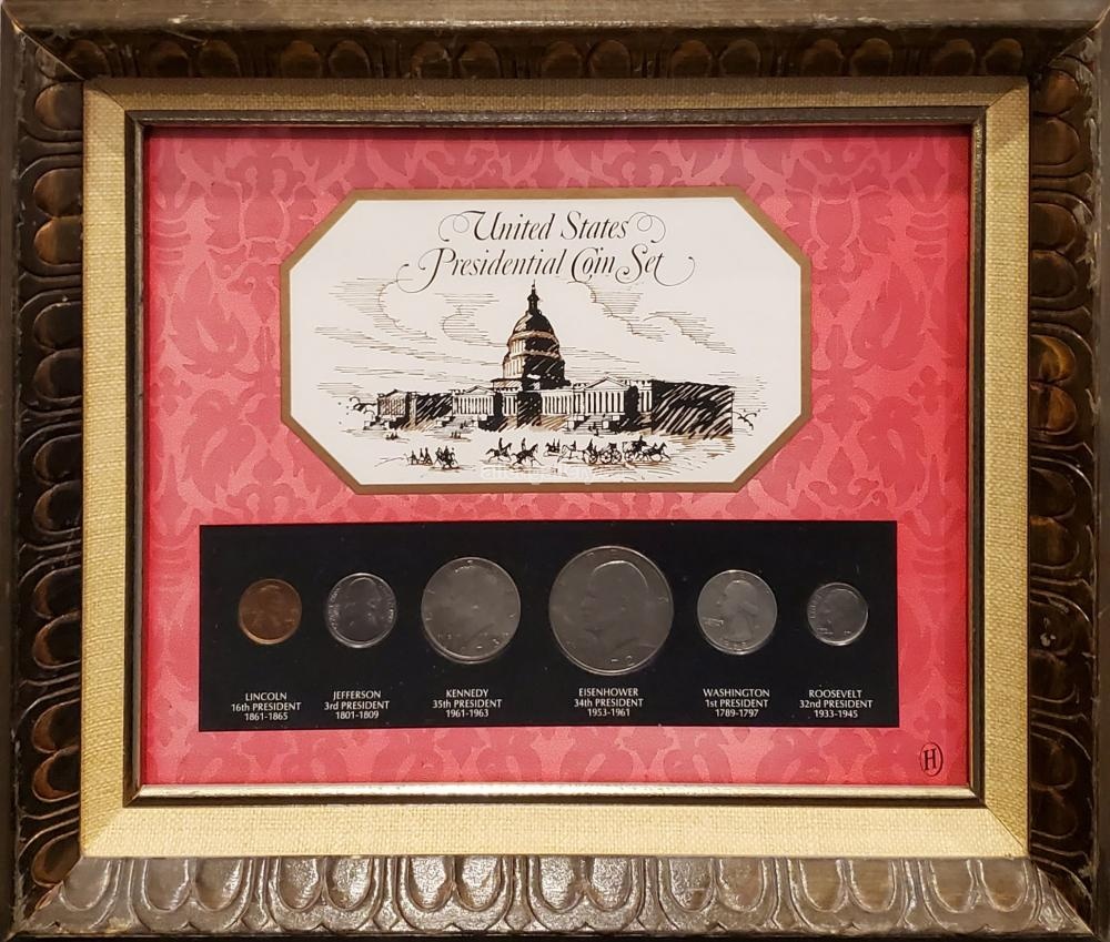US Presidential Coin Set - decorative coin display in patterned frame with linen liner & silver fillet - Set of 7