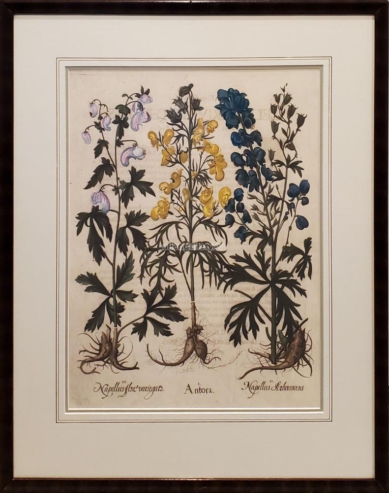 Antora & Napellus (Besler Floral I) c.1613 - double matted coloured engraving with hand embellished mat