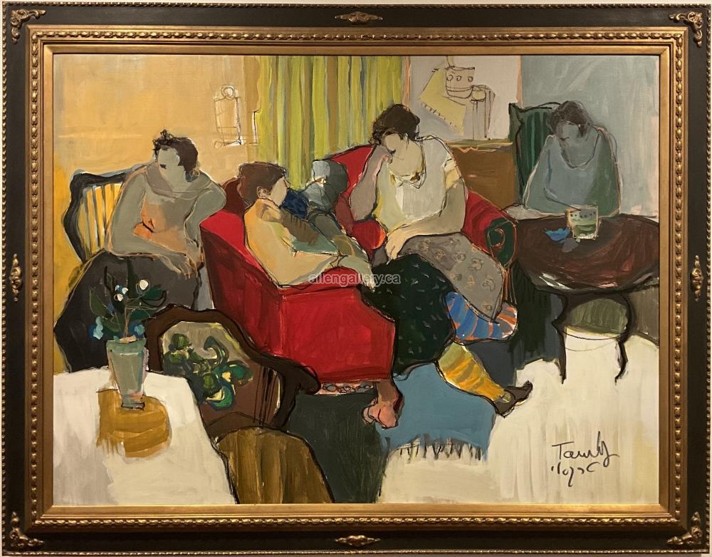 Ladies in the Parlour c.1985 - original oil painting - corner and side embellishments with gold beading on inner part of frame - signed in both English & Hebrew - THIS IS NOT CLEARED & NEEDS CLEARANCE by PRODUCTION FOR RENTAL