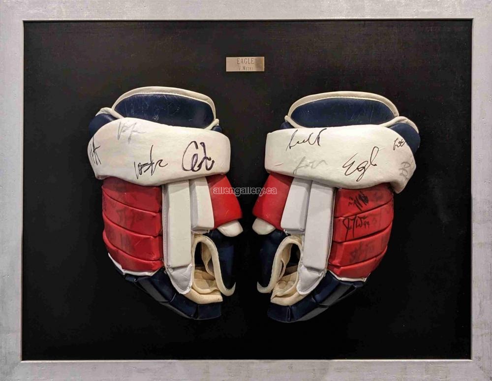 Hockey Gloves with brass plaque "Eagle" - signed - mounted to black board in a frosty silver frame - Set of 2