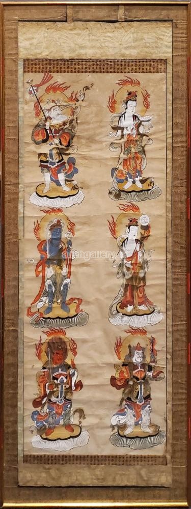 Four Heavenly Kings and Two Bodhisattvas c.1845 - original ink and colour on paper mounted to silk - regular glass cannot be removed
