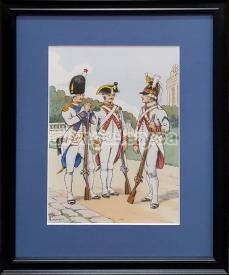 Infantry at Ease c.1789 - hand-coloured engraving in elegant frame - Set of 2